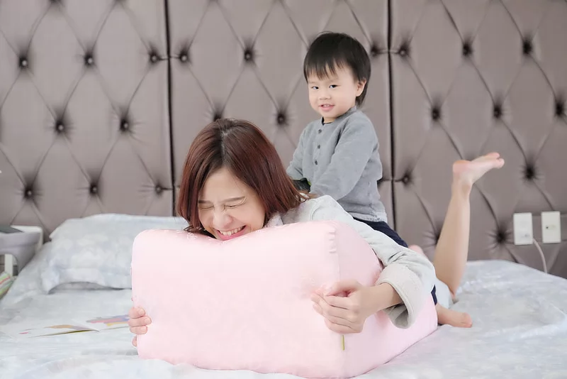 產後用抬腿枕來背靠,可以減輕爸爸媽媽瓶餵或親餵哺乳時的腰背負擔,更是親子互動時光的好幫手。