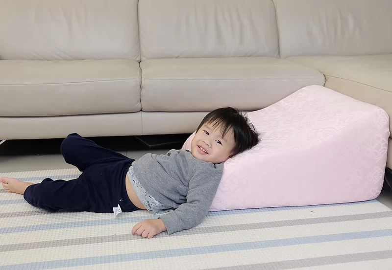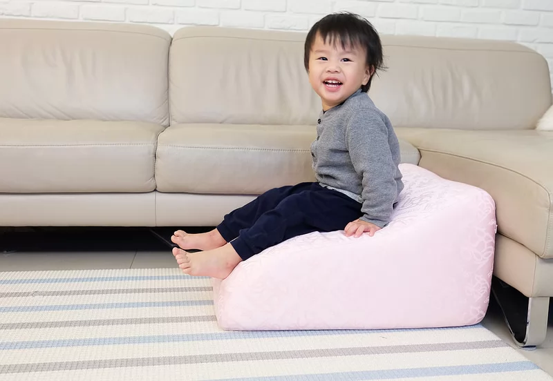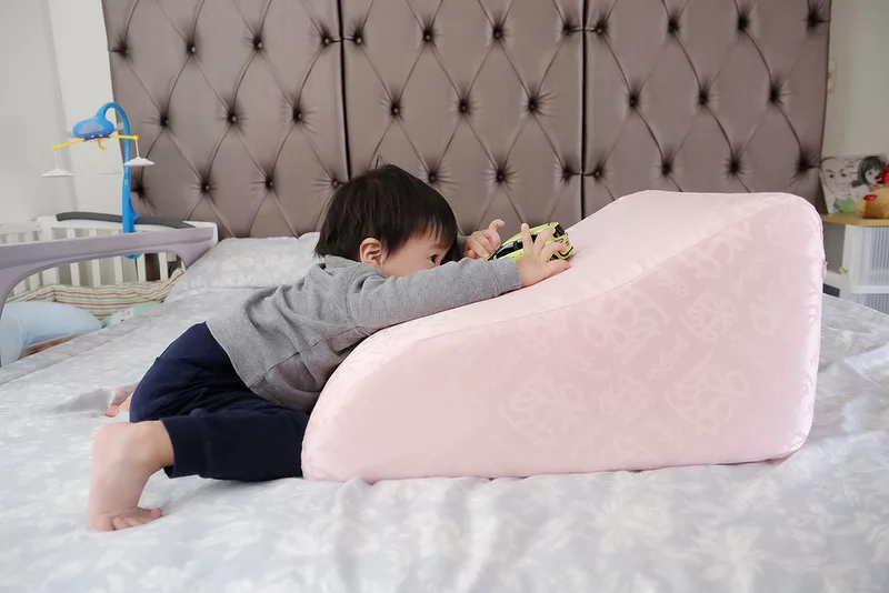 除了可以放在床邊當做訓練寶寶上下床的輔助枕(需有成人陪同),也可以放在床邊保護寶寶不慎翻落時,緩衝並減輕其傷害。很多小朋友也會把抬腿枕當成小型溜滑梯或小山丘來扮家家酒。