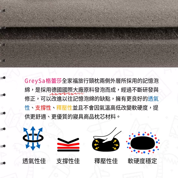GreySa格蕾莎全家福旅行頸枕所採用的記憶泡綿,是採用德國國際大廠原料發泡而成,經過不斷研發與修正,可以改進以往記憶泡綿的缺點,擁有更良好的透氣性、支撐性、釋壓性並且不會因氣溫高低改變軟硬度,提供更舒適、更優質的寢具商品枕芯材料。