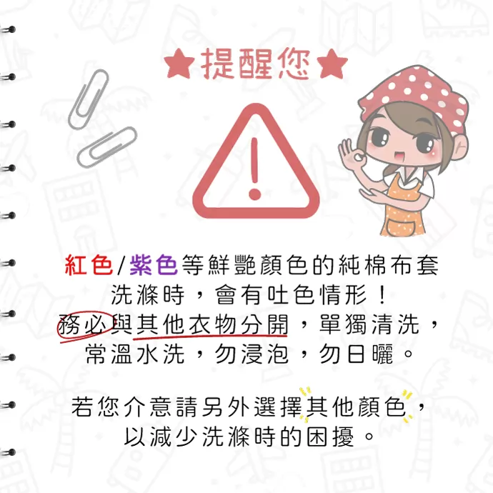 紅色/紫色等鮮艷顏色的純棉布套洗滌時,會有吐色情形!