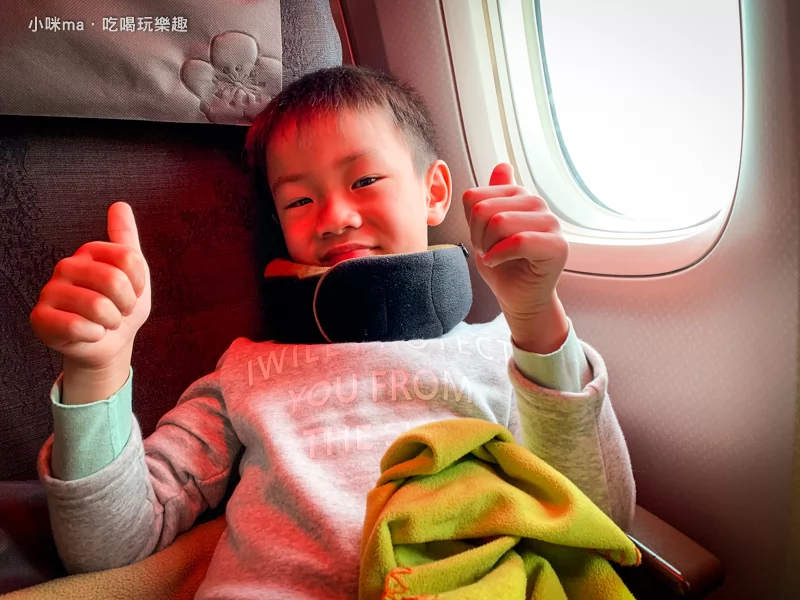 米寶的高度還無法靠到飛機椅的頭墊部分,用了GreySa格蕾莎 全家福旅行頸枕就能幫忙支撐懸空的部分