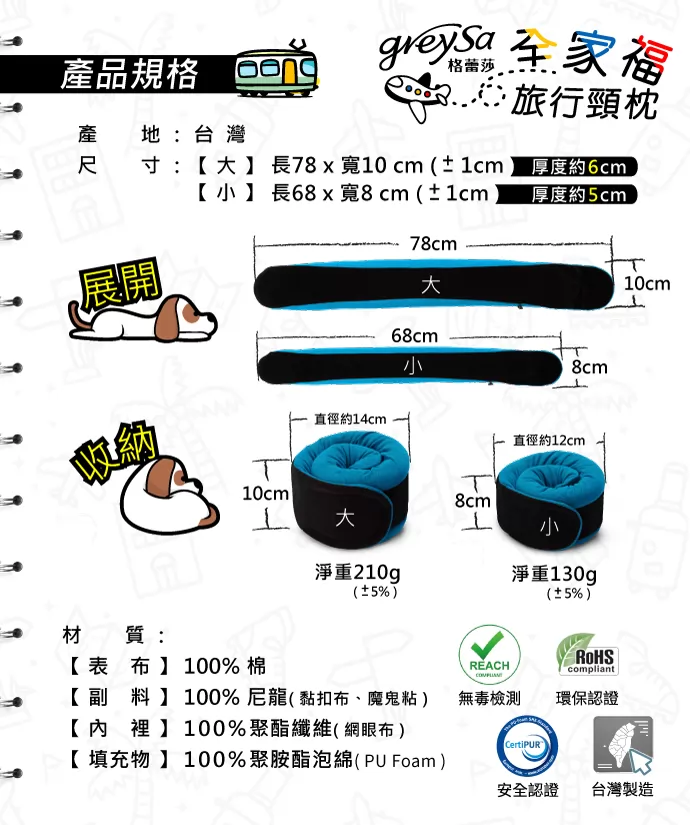 GreySa格蕾莎 全家福旅行頸枕分成兩種尺寸,100%台灣製造使用起來更安心