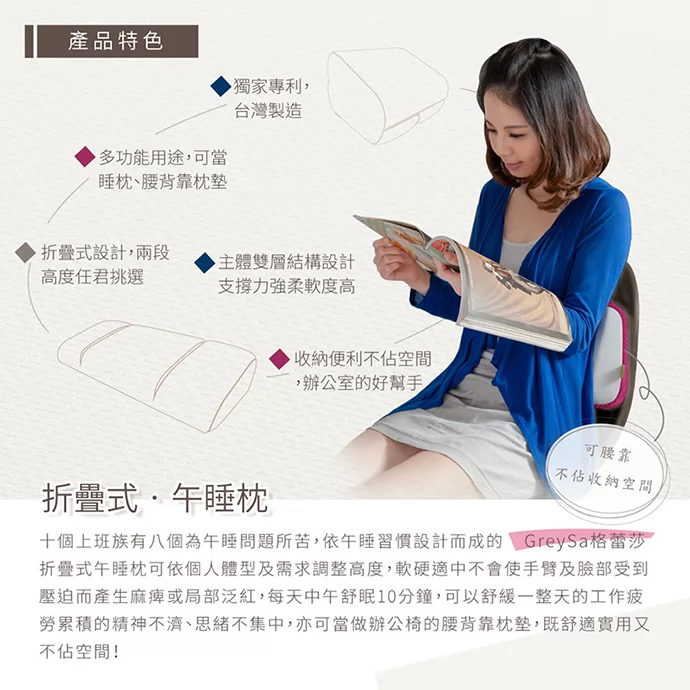 十個上班族有八個為午睡問題所苦,依午睡習慣設計而成的GreySa格蕾莎折疊式午睡枕,可依個人體型及需求調整高度,軟硬適中不會使手臂及臉部受到壓迫而產生麻痺或局部泛紅,每天中午舒眠10分鐘,可以舒緩一整天的工作疲勞累積的精神不濟、思緒不集中,亦可當做辦公椅的腰背靠枕墊,既舒適實用又不佔空間!