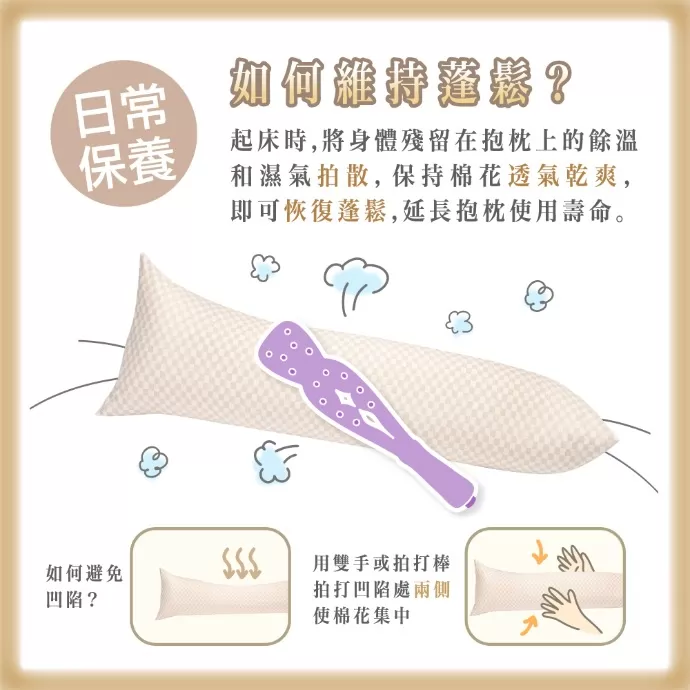 起床時,將身體殘留在抱枕上的餘溫和濕氣拍散,保持棉花透氣乾爽,即可恢復蓬鬆,延長抱枕使用壽命。