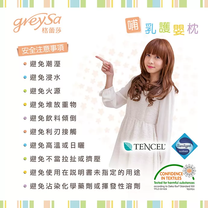 GreySa格蕾莎哺乳護嬰枕的枕頭套,採用國際品牌TENCEL®天絲纖維材質,並使用瑞士第一品牌Sanitized®的防菌技術,讓您更舒適、清新、安心地享受優質的育嬰生活。