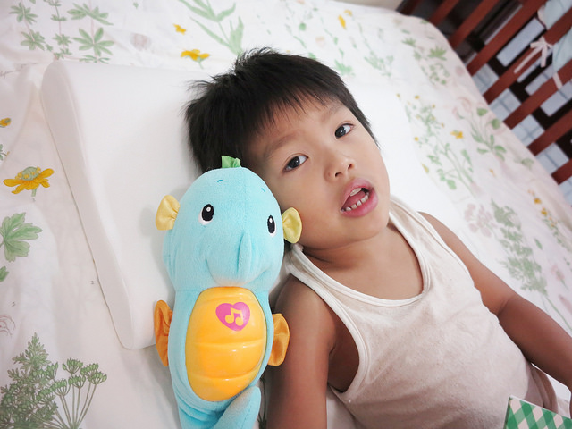 小燒賣兩歲半以後,我就讓他睡羽毛枕,羽毛枕的特性是柔軟,但很容易就睡扁了,所以每天晚上睡之前都要把它拍鬆才能躺。