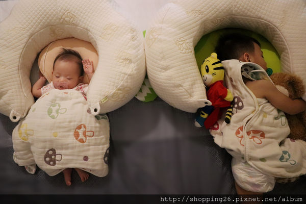 現在晚上睡覺太太就是孩子們一人一個,柯比超級喜歡被護嬰枕圍繞著有一種在自己的小世界裡睡覺的感覺,每次媽媽一關燈、然後放上晚安音樂,我們家柯比就會乖乖就寢,整個很配合.(#原來老嬰兒還是一樣很需要安全感啊)