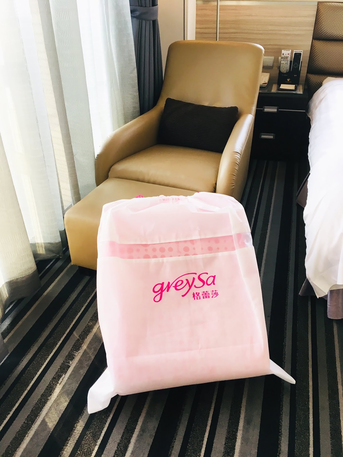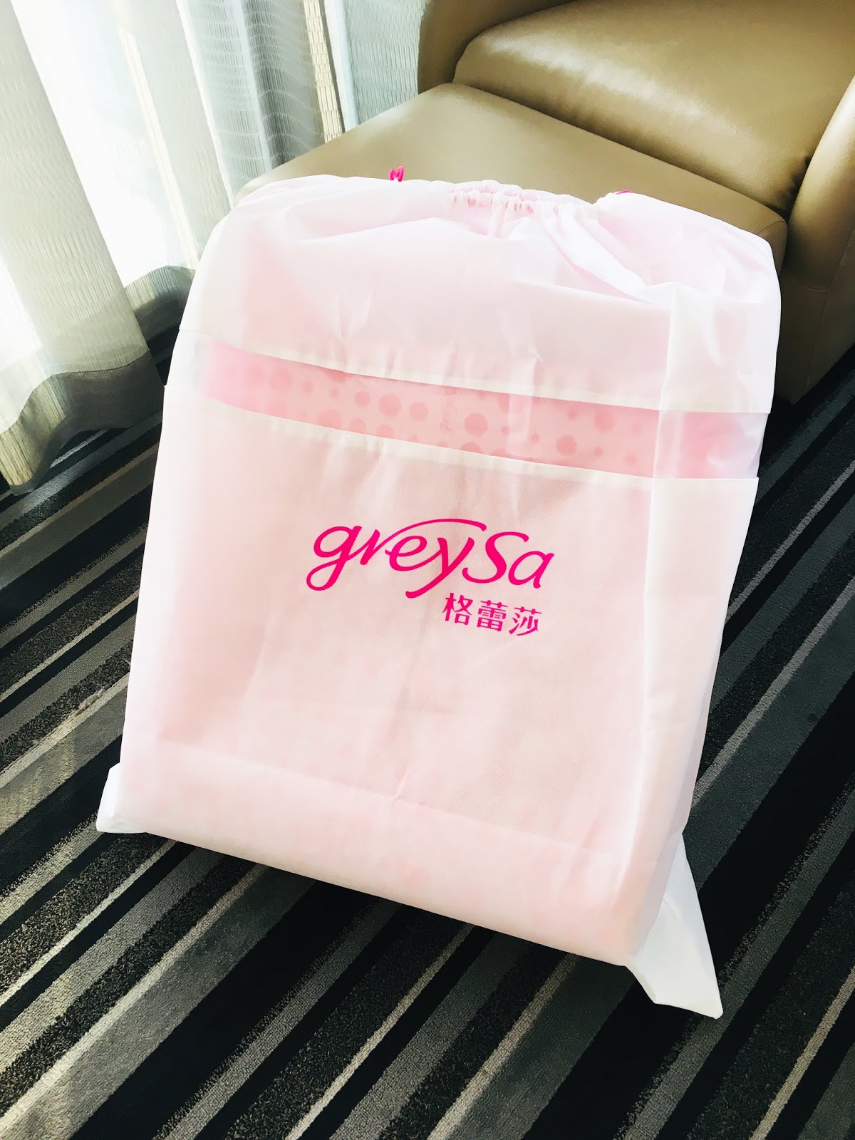 「GreySa格蕾莎」以宅配寄到家的「抬腿枕」,是收在白色的束口收納袋裡的,平時收納或外出時都很方便防塵和攜帶。