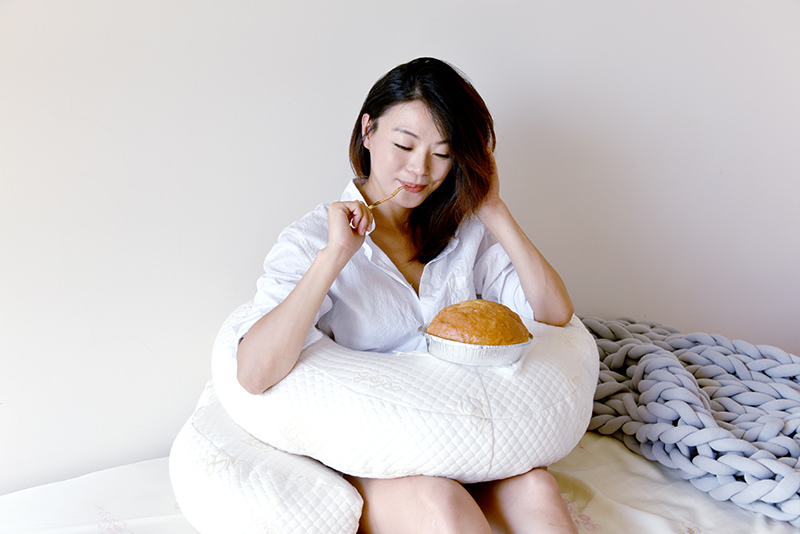 有時候半夜睡不著或是胃不舒服的時候,我就會坐起來,把兩個疊再一起,自己窩在裡面,手會舒服的放在月亮枕兩側,過一下就會有睡意了!哈!