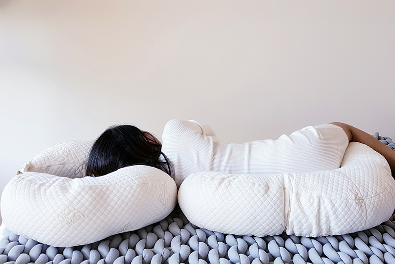 午睡的時候,我會把兩個月亮枕扣再一起,自己躺在中間,把頭部跟腿部墊高,像躺在游泳圈這樣,弧度剛剛好,使用上的感受一樣也是很舒服,減輕了孕婦重量上的負擔!