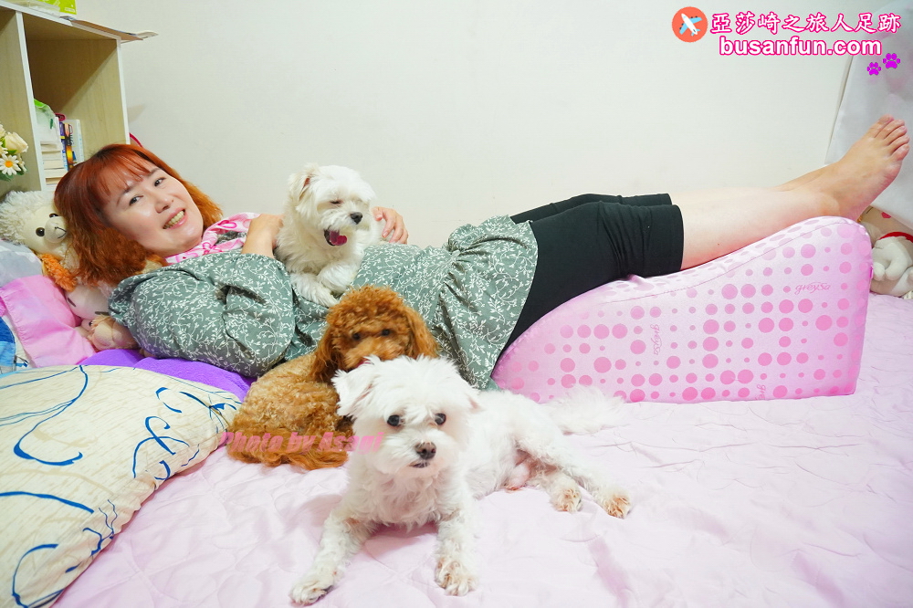 ^^亞莎崎在日常生活使用上,還會把格蕾莎抬腿枕當作側臥靠枕,跟我家的馬爾濟斯兒子們玩耍,或是看著牠們玩耍時用來支撐側臥的身體。