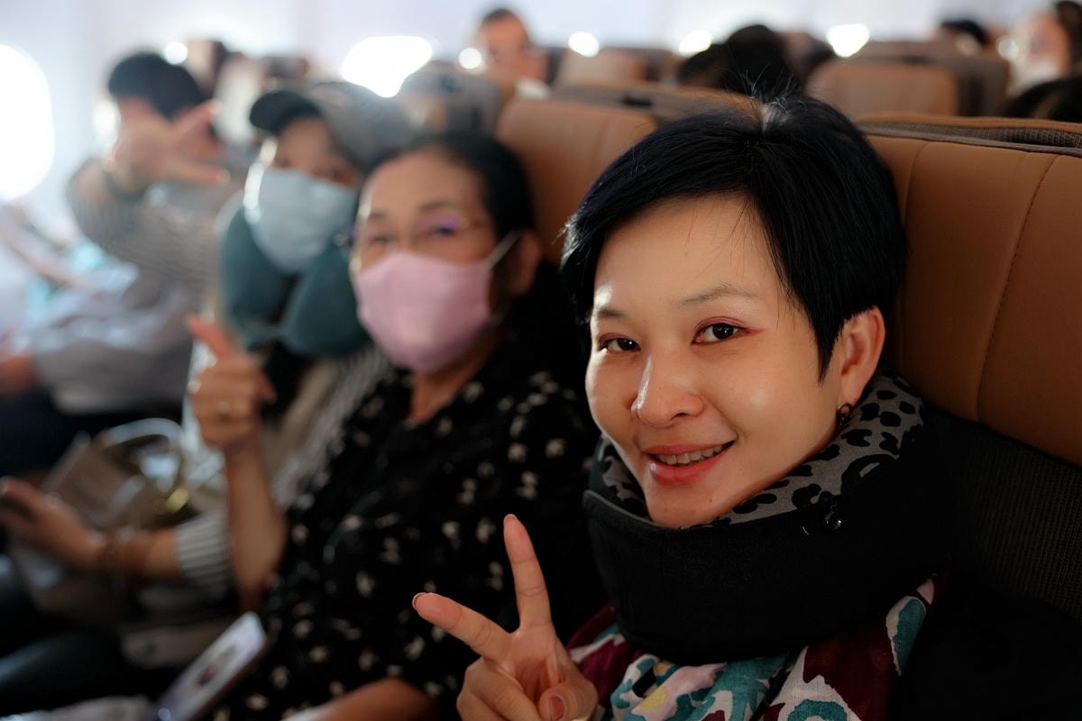 婷婷上飛機後立刻戴上 GreySa格蕾莎【全家福旅行頸枕】 脖子彷彿找到支撐點 不管是正坐休息或側靠睡覺都能穩穩托住頭 這趟是與家人同行