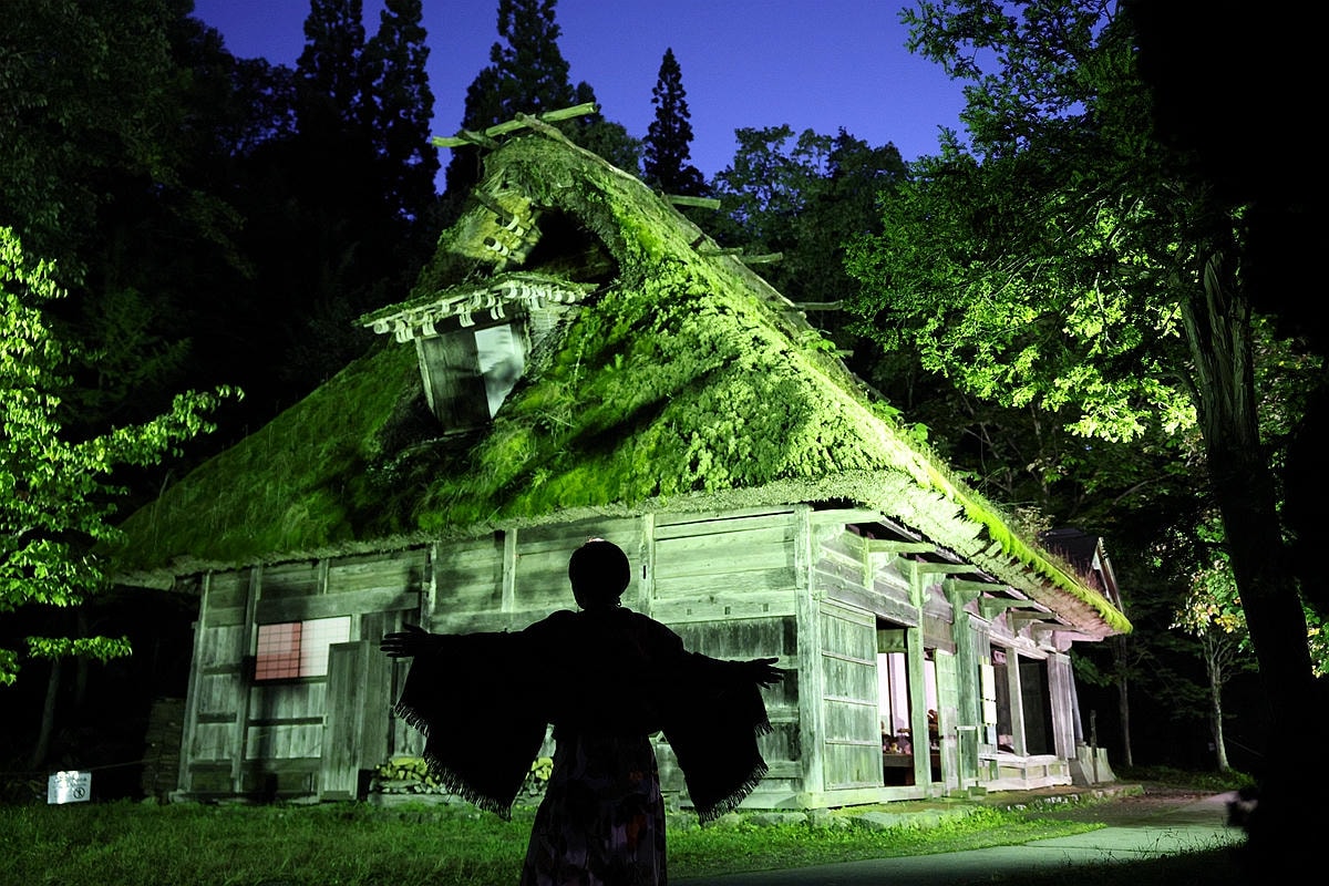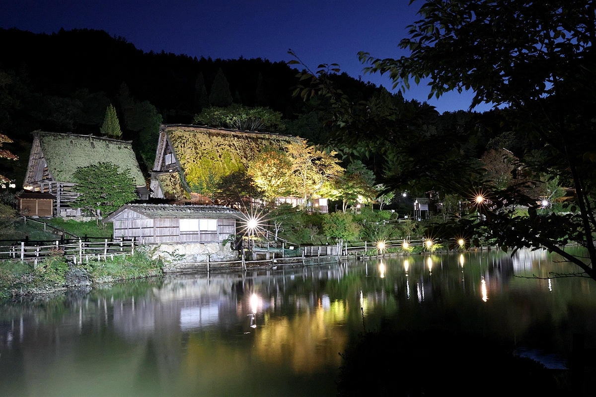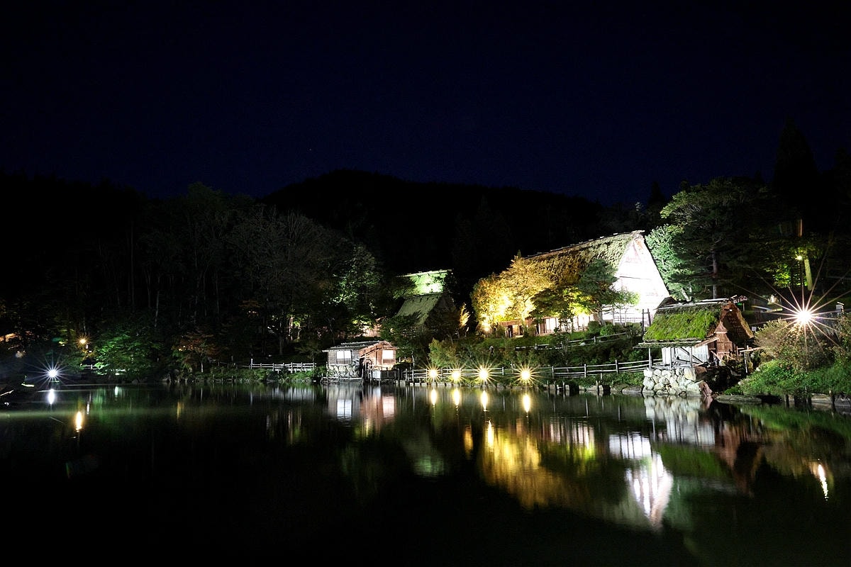 夜幕降臨後的飛驒之里更有魔力 古老茅草屋在燈光映照下 彷彿化身神秘的森林小屋 靜靜坐落在樹影與夜色之間