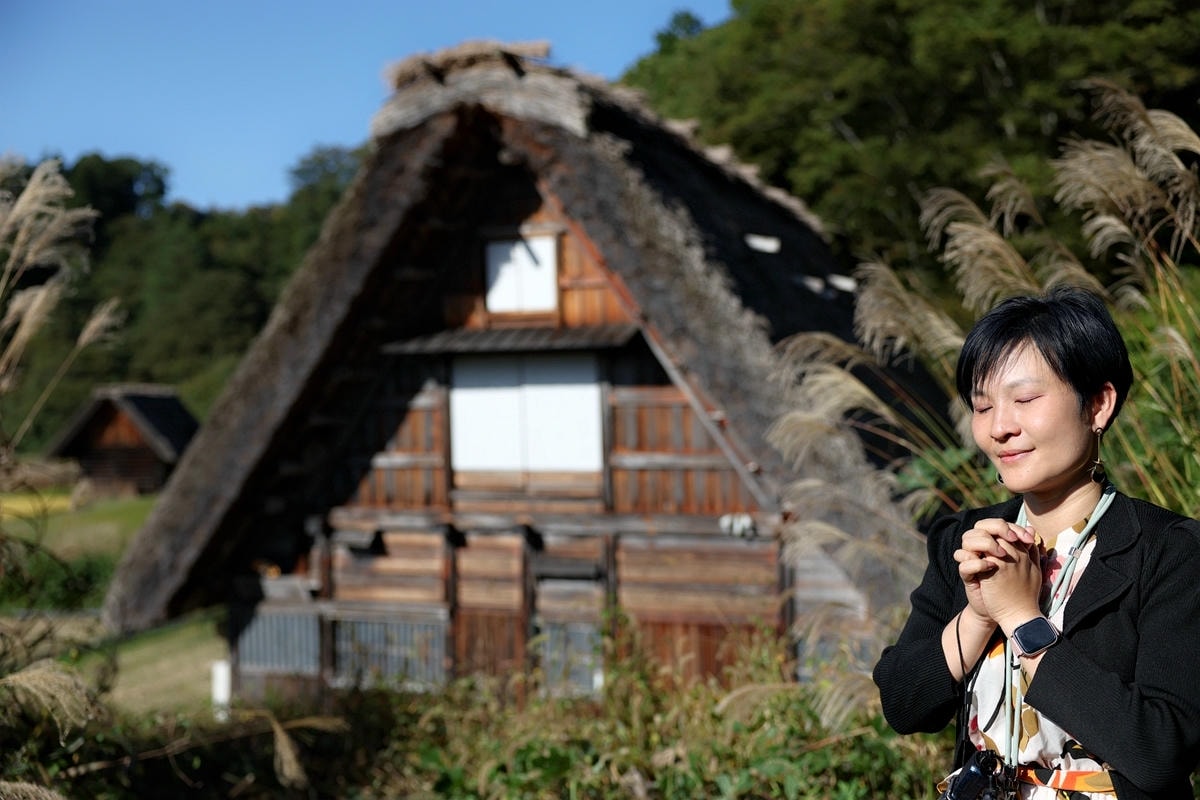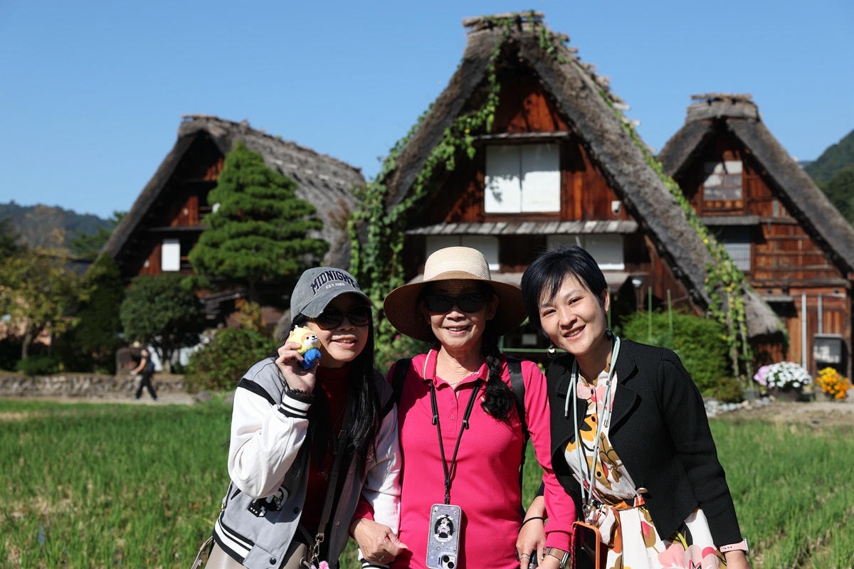 再來到世界文化遺產・白川鄉合掌村 秋日的藍天襯托著合掌造民宅 屋頂覆著厚厚茅草